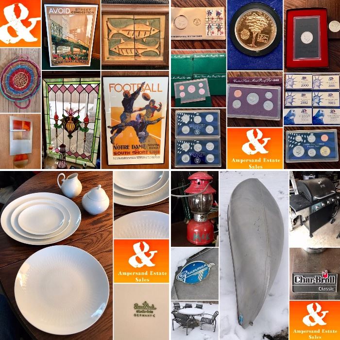 & Ampersand Estate Sales Friday February 21st – 9am to 3pm and Saturday February 22nd – 10am to 3pm 643 Euclid Avenue Highland Park, IL 60035 Pop Up Estate Sale in a cute Highland Park home that will soon be for sale – with a contemporary furniture pieces, framed art pieces, a Grumman Canoe, vintage Boy & Sea Scout collectibles, vintage chalkware figurines, costume jewelry, collection of vintage wrist watches, pocket watches, 3 sets of Sterling Silver flatware, Sterling Silver serving pieces, crystal & glass decanters, Rosenthal Romance China & Stemware, Blue Danube China set, Morgan parking sign, hubcaps &...