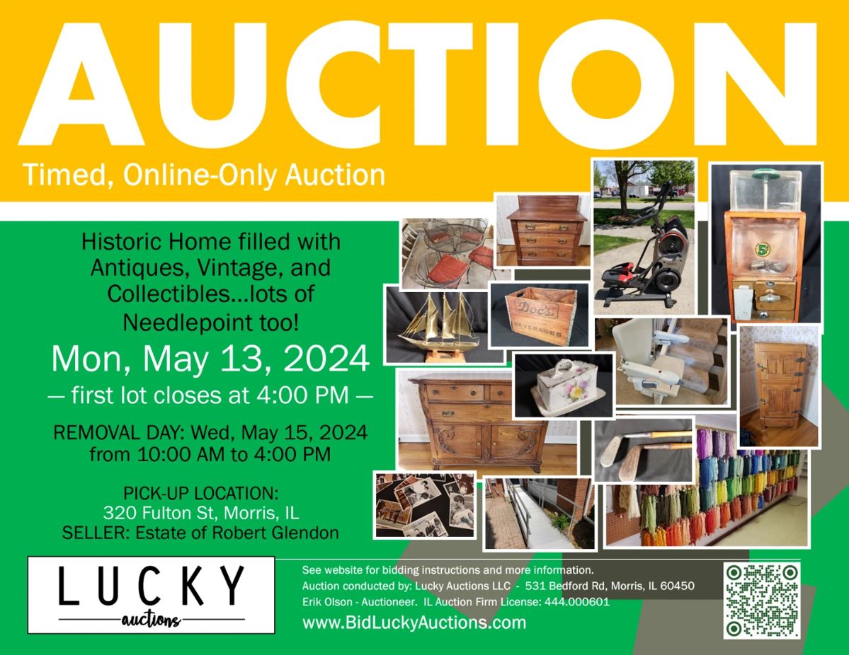 Bidding closes Mon, May 13, 2024 @ 4:00 PM. Historic Home in Morris, IL filled with Antiques, Vintage, and Collectibles…lots of Needlepoint too! This is a Timed, Online-Only Auction in Morris, IL. NO shipping. No drop-offs. Pick-up only. Bidding is now open. Bidding now open >> www.bidluckyauctions.com. WHAT TYPE OF AUCTION : This is a Timed, Online-Only Auction in Morris, IL. NO shipping. Pick-up only. Bidding is now open. WHAT TYPE OF ITEMS : Historic Home filled with Antiques, Vintage, and Collectibles…lots of Needlepoint too! WHEN DOES IT END : The first lot will start CLOSING: Monday, May 13, 2024...