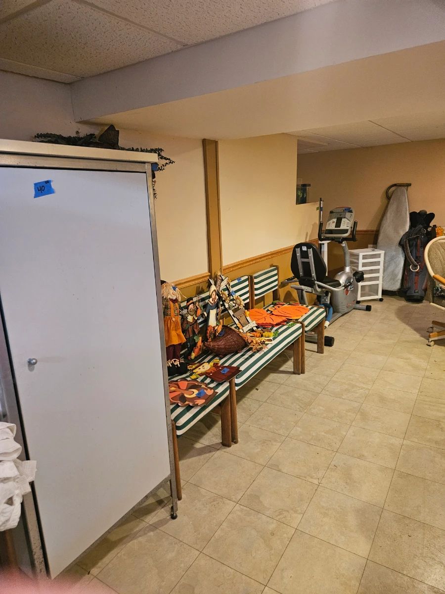 Bedroom bed, 2 dressers, love seat, couch, chair, end tables, lamps, household & kitchen items, desk, filing cabinet, pictures, book cases, garden items, pillows, picture frames, bears items, candles, some tools, cassette tapes, dad's, visuals tapes, books, magazines, holiday decorations, luggage, meat slicer, food processor, sewing machine, table and chairs and more.