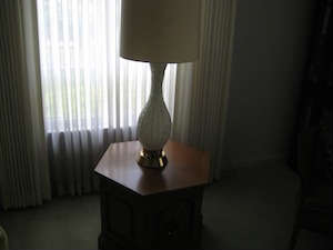 This is a 4 bedroom home with a garage and packed basement. This homeowner was certainly the handyman. Living Room: Vintage glass lamp Raised Panel Table 2 Cane Chairs ( vintage) 1 sofa Small round occasional table Belleek: Millennium Collection Pitcher 1999, Candy Vase and small dish Signed glass bird Noritake Bell Wedgewood Dish Reman Jesus, Joesph and Mary China Rose Brass Candle sticks Butterfly Dishes China Inarco-Mugs Brass Bowl 2 Drexel End Tables with Drawers 2 Crystal Lamps Sofa 3 Level Ottoman Den: Sofa TV and stand Kitchen: There will be some pots, pans and dishes Oak Table with...