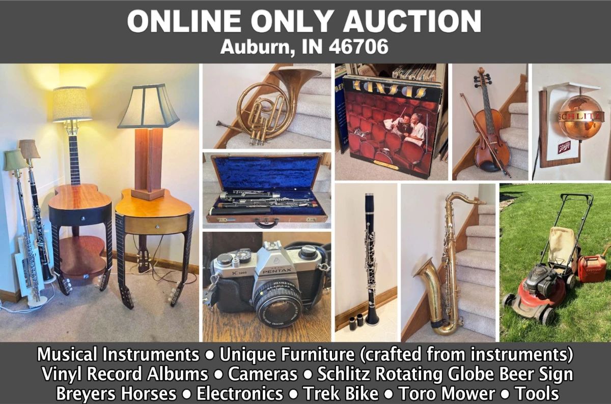 ONLINE ONLY AUCTION Large Collection of Musical Instruments and Instrument Parts, Instruments Repurposed into Unique Furniture & Home Accent Pieces, Vintage Vinyl Record Albums, Men’s Clothing/Outerwear & Footwear, Housewares, Breyer Toy Horses, Cameras, PS2 Video Games, Lawn Mower, Trek Bicycle, Vintage Schlitz Beer Rotating Globe Sign, Decor, Tools and More! Auction Begins: Friday, April 24th @ 5:00 p.m. EST Auction Ends: Friday, May 1st with first lot closing @ 7:30 p.m. EST WE CAN SELL YOUR COLLECTIBLES – CALL TODAY FOR MORE INFO – 260-441-8636 PICKUP DETAILS • Pickup location: Auburn, IN 46706 (full address will appear on winning bidder...