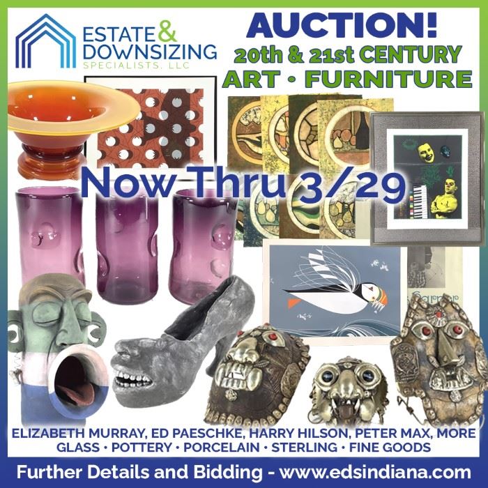 Online only Wednesday March 29 with soft close starting at 7:00 PM Rare and Unusual Contemporary Art & Furnishings will close Wednesday March 29th beginning at 7PM including a fantastic 2001 Elizabeth Murray Gemini GEL Edition three dimensional print, Ed Paeschke Litho & Silkscreen, Work by Dick Wray - Texas and a fine group of works by Harry Hilson, gouache costume designs by Freddy WIttop, Peter Max signed Liberty Series poster, Charley Harper silkscreens with an interesting group of smalls featuring glass, pottery, porcelain, sterling and fine goods. Unique figurals of Occupied Japan pixies, monkey band & other uniques. Cool...