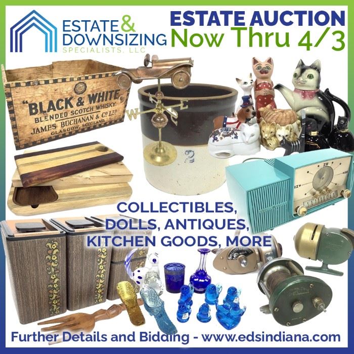 Online Only Monday April 3, 2023 with soft close at 7:00 PM Monday April 3rd Online Only General Estate Auction. This auction has something for everyone. We have collectibles, dolls, antiques, kitchen goods, new-unused scented candles in large lots, New to Antique glass and china, NIB clothing hangers, home decor, holiday goods, furniture and furnishings of all kinds & lots of Vintage Goods. Items to be added up to Friday March 31st so check back often. Everything takes place at the: EDS AUCTION CENTER - 701 S Ransom Lane, Bloomington IN 47403 SALE ENDS on Monday April 3rd at 7PM...
