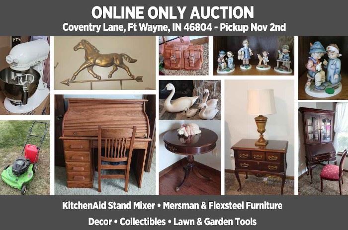 ONLINE ONLY AUCTION MERSMAN & FLEXSTEEL FURNITURE • KITCHENAID STAND MIXER • REFRIGERATOR • LAWN & GARDEN POWER TOOLS • DECOR • GARMIN AVIATION NAVIGATION & TELEX HEADSETS • COACH PURSE • HOUSEWARES Auction Begins: Tuesday, Oct 25 @ 7:00 p.m. EST Auction Ends: Sunday, Oct 30, with first lot closing @ 7:00 p.m. EST PICKUP DETAILS • Pickup location: Coventry Ln, Fort Wayne, IN 46804 (full address will appear on winning bidder invoices) • Pickup date and time: Wednesday, November 2nd, 10 a.m. - 1:00 p.m., by appointment only Please bring your own packing and moving supplies. If you...