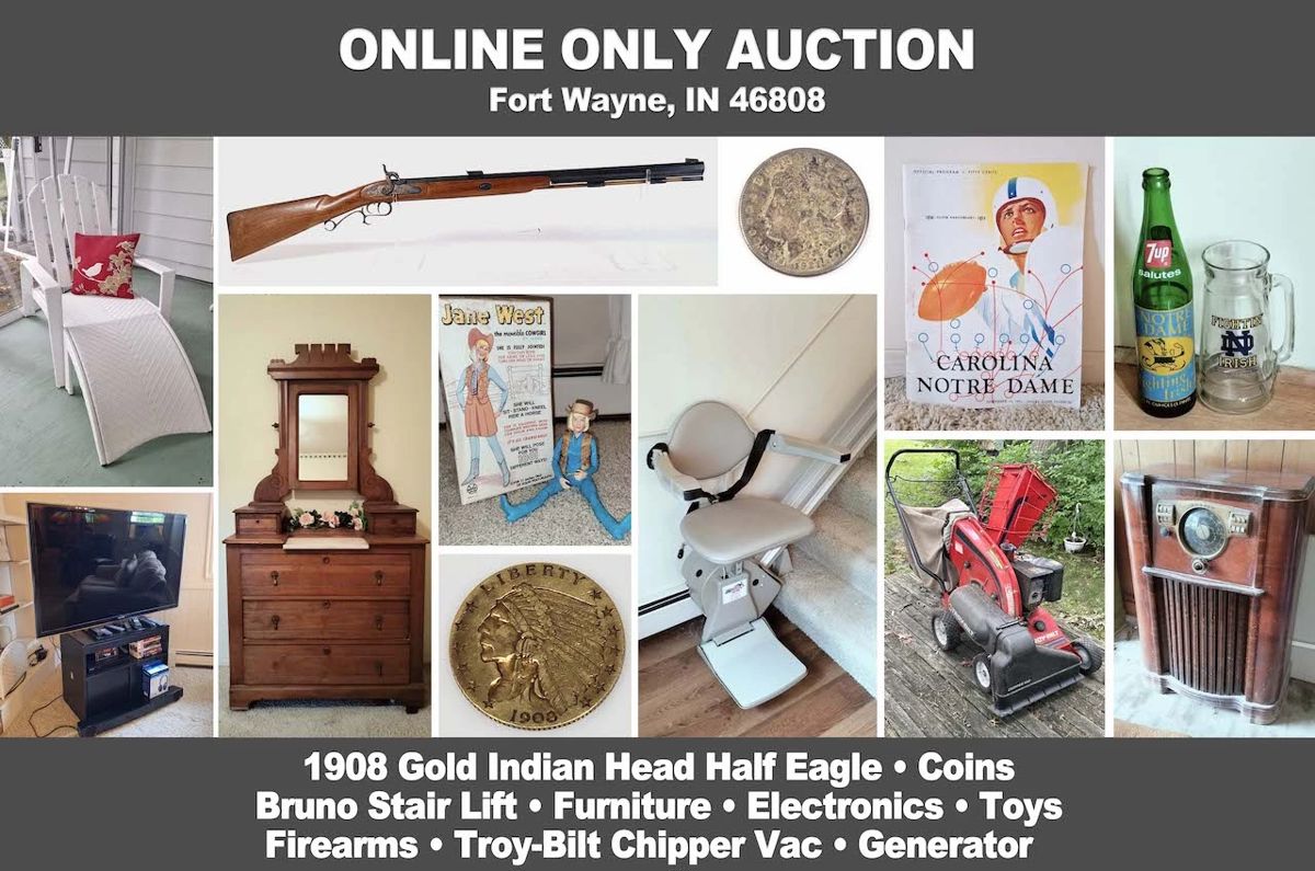 ONLINE ONLY AUCTION BRUNO STAIR CHAIR LIFT • COINS • FIREARMS • HUNTING GEAR & AMMO • ELECTRONICS • VINTAGE TOYS • POTTERY • CHINA • TROY-BILT CHIPPER VAC • COLEMAN POWERMATE 6250 GENERATOR • FURNITURE & DECOR • HOUSEWARES • 1954 NOTRE DAME / CAROLINA FOOTBALL PROGRAM • COLLECTIBLES • TOOLS • BLACK & DECKER WINDOW AIR CONDITIONER • SHARK & DYSON SWEEPERS & MORE Auction Begins: Monday, July 1st, 2024 @ 5:00 p.m. EST Auction Ends: Monday, July 8th with first lot closing @ 7:30 p.m. EST PICKUP DETAILS • Pickup Location: Fort Wayne, IN 46808 (full address...