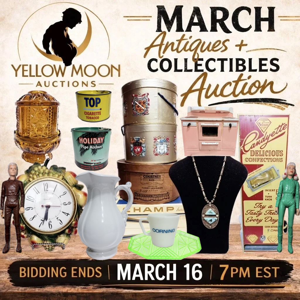 Welcome to the next Yellow Moon Auctions consignment sale! Internet only auction. The auction runs Tuesday 2/24/26 until Monday 3/16/26. The first lot closes at 7PM EST on Monday 3/16/26 with a soft close and stagger of 15 seconds. Invoices are sent at the conclusion of the sale. This is a curated multi-consignor auction featuring select pieces from estates, private collections, and local consignors. Because items come from a variety of homes and sources, condition and age will vary. Please review all photos and descriptions carefully before placing a bid.