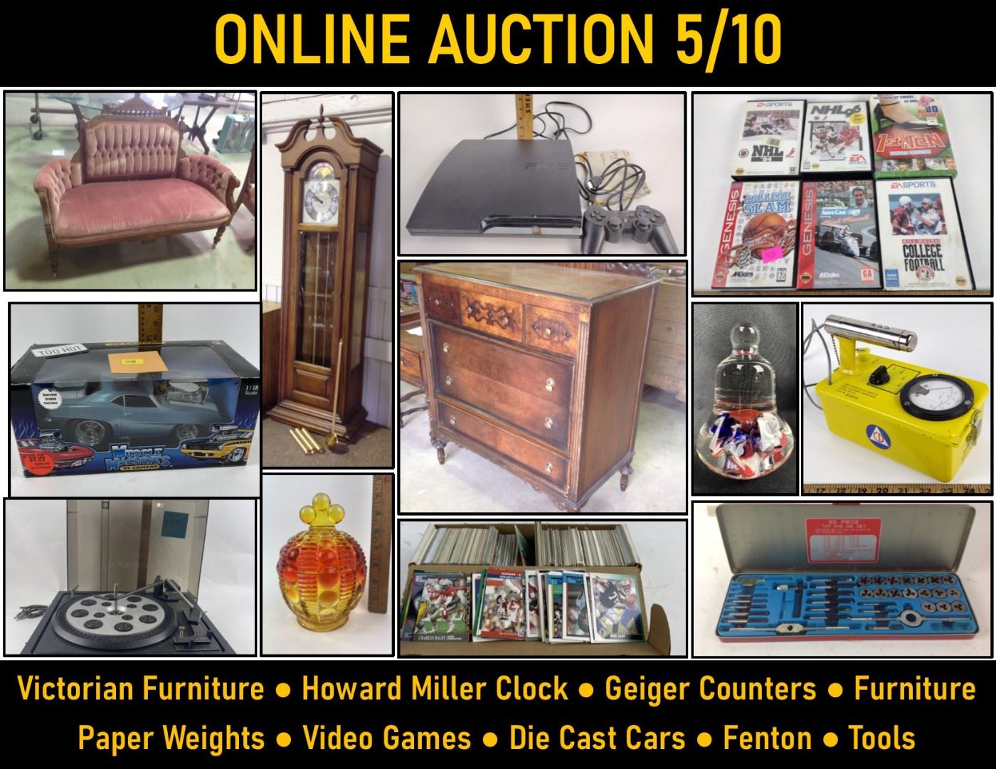 Tools, Electronics, Victorian Furniture, Pyrex, Geiger Counters, Die cast cars, Air Compressor, Howard Miller Clock, Paper Weights, Fenton and Games (Sega, Nintendo, Playstation) Preview 5.9.2023 9a to 5p at 2110 McConnell Drive, New Haven, IN 46774 Online only auction starting May 10 at 6:30p with the first lot ending in a staggered close. Pick up May 11 at 11:30 to 5:30 at 2110 McConnell Dr, New Haven, IN https://aaaauctionservice.hibid.com/ Cast iron pig Royal Doulton figurine Porcelain chocolate pot, plates, creamer & sugar Stained glass window hanger, clock, faux Framed pictures, throws, ceramic pots, Magnavox Sunbeam mixmaster and cover Small kitchen...