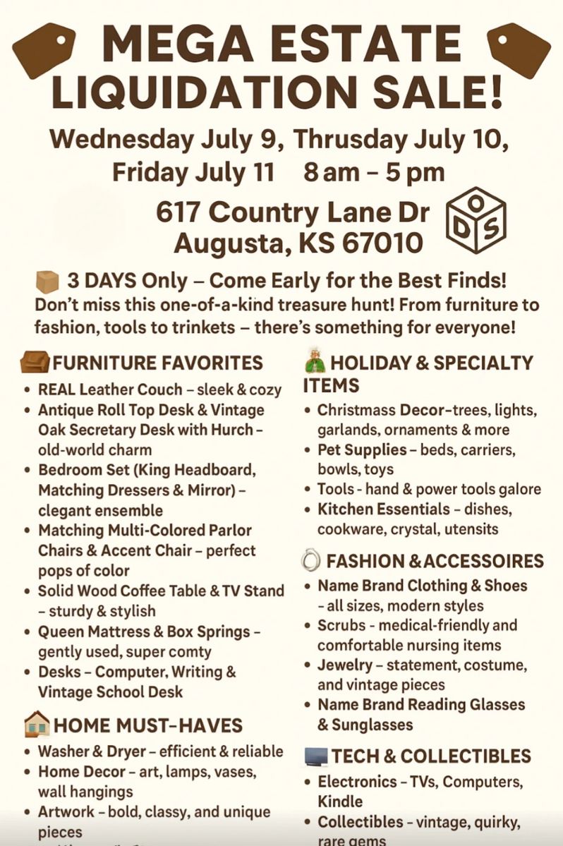 π·οΈ MEGA ESTATE LIQUIDATION SALE! π·οΈ Hosted by: D.O.S. BY JESS (Downsize, Organize, Services) π¦ 3 DAYS Only β Come Early for the Best Finds! Donβt miss this one-of-a-kind treasure hunt! From furniture to fashion, tools to trinkets β thereβs something for everyone! ποΈ FURNITURE FAVORITES REAL Leather Couch β sleek & cozy Antique Roll Top Desk & Vintage Oak Secretary Desk with Hutch β old-world charm Bedroom Set (King Headboard, Matching Dressers & Mirror) β elegant ensemble Matching Multi-Colored Parlor Chairs & Accent Chair β perfect pops of color Solid Wood Coffee Table & TV Stand β sturdy &...