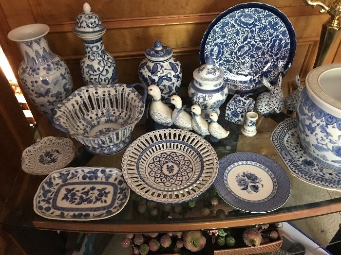 **This house if FULL of stuff. There is tons of new, unused items. Check it out below and be sure to look at the photos:) FURNITURE Navy upholstered wingback chair**Upholstered navy sofa**several side tables**matching side table (x2) sofa table and coffee table with glass insert**TV stand**TV cabinet**Bassett side table**LOTS of white bookshelves (nice)**French provincial style dining table with 6 chairs and leaf**small buffet with fold open sides**china cabinets**small curio cabinet**blue check Simmons sleeper sofa**navy recliner with matching ottoman**windsor style wooden bench**white sewing machine table**Waterfall style linen cabinet**cute wicker kids chair**cute kids rocker**vintage white rocker/glider**desk**desk wall unit**barrister bookshelf**glass and brass sofa...