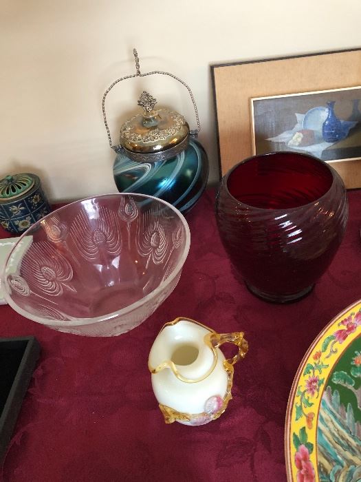 Nice Sale includes FURNITURE INCLUDING: Ethan Allen Bedroom Sets, Dining Room Table and Chairs, Hutch and more. All in beautiful condition. Good mattresses . Leather Sofa, Live Seat and Chair Cafe style Table and Chairs Matching Bakers Rack Klipsch Speakers ANTIQUES INCLUDE: Chinese and Japanese Ceramics Enamel Plaque KPM Vase Beautiful Dresden Type Lamp Steuben Selenium Vase Lalique Thistle Bowl Misc Cast Iron Toys Artwork Art Glass ( perhaps Loetz) cracker Jar Rose O’Neil Kewpie and more Large set Dansk Flatware Small lot Rosenthal “Modernist’ American Girl Dolls Pleasant Co Vintage Samantha, Kit and more Nice Calphalon cookware Good Cutlery...