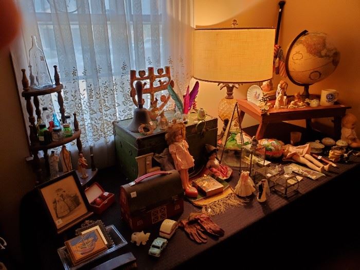 An absolute Treasure Trove! This dealers dream is full to the brim! Lots of mid century collectibles, novelties, & smalls, Monteray metal enamel dinnerware, Dude Ranch items, Early 19th Century photo albums, vintage souvenirs, vintage bottles, silver, penants, political buttons, vintage dolls including Shirley Temple, Barbie & friends, Pitiful Pearl & composition, Doll furniture, Disney items including Marx Tin Merry Makers Band, Fantasia centaur figurine, Dwarf Mugs, Sabino glass figures, Vintage clothes, Plates, Lamps, Ethan Allen Dining Table & Chairs, Mid century table & chairs, ice cream parlor chairs, antique wall telephone, Old music box with metal disc's, Worlds Fair...