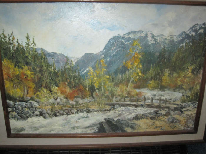 HOUSE AND GARAGE COMPLETELY FULL…. FURNITURE: Mid-Century Modern Round dining table and four chairs w/ chrome base; circa 1970’s modern bedroom set, Walnut; Mid-Century Modern coffee and lamp tables; oak roll-top desk; bookcases (some glass-front slide); excellent burgundy leather loveseat (with built-in recliner) and matching leather recliner; large Toshiba TV on stand; exceptionally tall (3 ½’) Mid-Century Modern wood lamp; pair pole lamps, other nice lamps, interesting wall-hangings including large painting by noted artist Ann Gethen entitled “Log Bridge”, AKAI Stereo system with speakers; much more….. SMALLS: Large Royal Copely and Rubens Head Vases; old Hand-painted planters; hand-blown blue-glass vintage...
