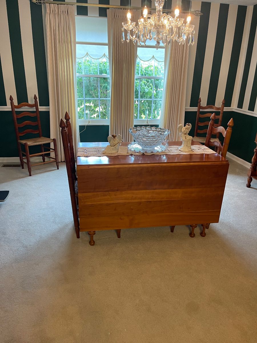 Living Estate Sale by The Junque Ladies Beautiful Home with Quality Furniture Campbellsville Cherry Dining Room: Drop Leaf Table with 4 Ladder Back Chairs & China Cabinet Campbellsville Cherry Tea Cart Howard Miller Curio Cabinet Bruno Heavy Duty Chair Lift Chuck Ripper Prints Terry Redlin Prints Nikko China Plates Longaberger Baskets Stiffle Lamps Willow Tree Figures Campbellsville Cherry Dresser with Mirror Beige & Dark Brown Tufted Back Side Chairs Queen Anne Side Chairs with Goose Neck Arms Campbellsville Cherry Corner Cabinet Campbellsville Cherry Wash Stand Campbellsville Cherry Drop Leaf Coffee Table Campbellsville Cherry Round Candle Stand Campbellsville Cherry Poster Beds...