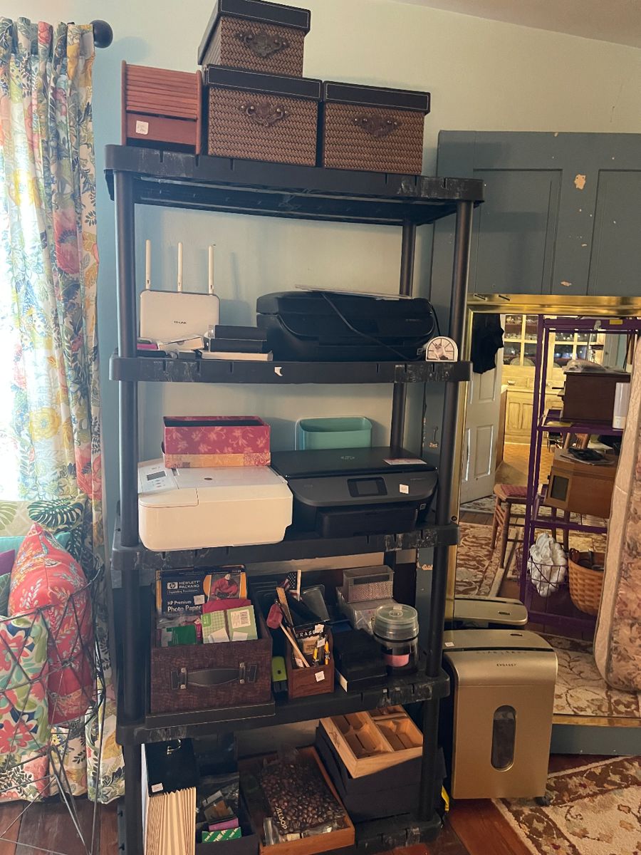 Estate Sale #2 by The Junque Ladies!! Large Floor Weaving Loom Table Top Weaving Loom White Sewing Table White Two Door Storage Cabinet White 3 Shelf Cabinets Singer Heritage Sewing Machine New Home USA Limited Edition Sewing Machine New Home Memory Craft 6000 Janome Memory Craft 9000 Quilting Fabric Pfaff Creative 7550 Pfaff Hobby Lock Serger 4870 Quilting Kits Vintage Feed Sacks Sewing Items Thread, Buttons, Patterns Handmade Baskets Area Rugs Hickory Mark Sofa Knitting Yarn & Items Giraffe Needlework Stand Vintage Sculptures Craft Items Mission Oak Morris Chair Antique Oak Wheelchair Antique Flatwall Early Pine Trunk Vintage Oak 6...