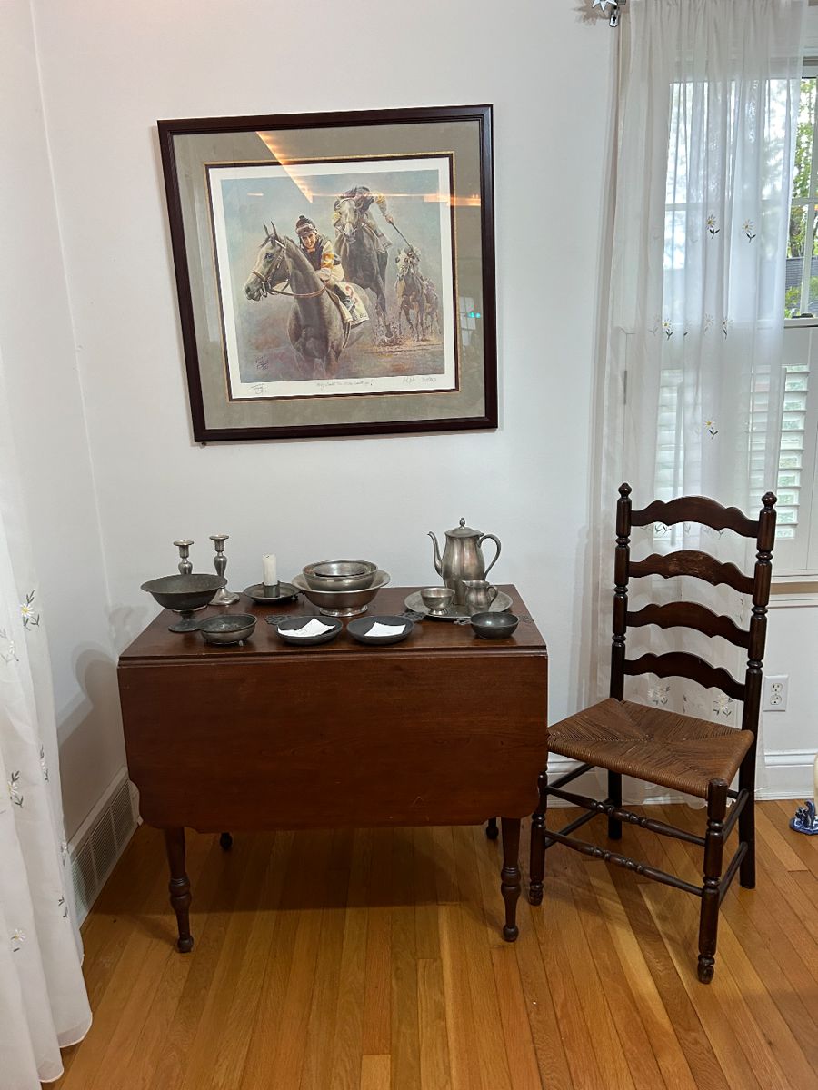 Kathryn Gillispie, West Virginia artist, large scale watercolors Fred Stone signed Derby print of Holy Bull also signed by the winning jockey large book collection Ethan Allen slip covered furniture Italian pedestal table with butterfly leaf and four rush bottom chairs South Carolina, North Carolina, and Kentucky pottery antique doll collection Craftmaster sectional sofa holiday decor linens clothing craft table guitar fountain lamps wicker outdoor furniture tools rugs kitchen items records 1980 Bruce Springsteen concert poster Excellent sale with a large assortment of quality items