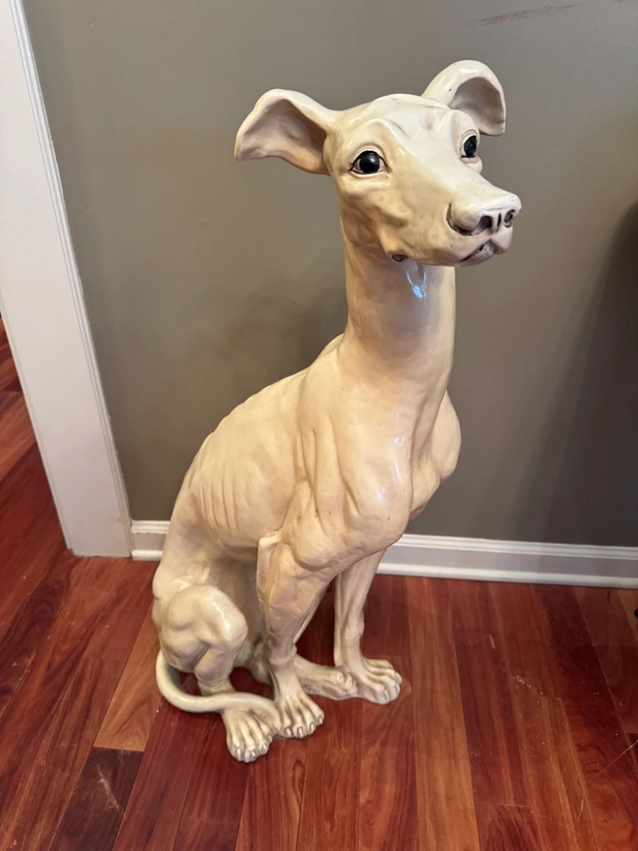 This is a sale you don't want to miss. Lot's of great antique and vintage items. Furniture to include, King size bed, two highboys, desks, buffet, cherry bed and dressers, set of Eastlake dining chairs, side tables, tall dining table and chairs, camel back sofa, and more. Antique china, cut glass, crystal, Fenton, blue and white pieces and lots of nice glassware. Bronze statue, mid-century dog statue, cast iron pans, prints, lots of dog related figurines and pieces. Grayhound bus bench and mat. Quilts, needlepoint pillows, and a few rugs. Tons of high end mensware in L & XL. Suits...
