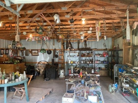 House - Includes items such as furniture, appliances, dishware, cookware, art, lamps, rugs, books, Beanie Babies, Breyer horses, electronics, antiques, lead crystal, china, porcelain, brass, apothecary jars, decanters, sports memorabilia, jewelry, toys, Pokemon, baseball cards, basketball cards, football cards and more. Shop - Includes large assortment of antiques, McCoy pottery, Griswold, Lodge, Wagner cast iron, Hemmingway insulators, carnival glass, depression glass, milk glass, Coke, Pepsi, NASA, Derby, Beam, Schlitz, Libbey, Pacman, Looney Tunes, and much more...too much to list. Barn - Saddles, bridles, bits, leads, halters, antique livestock/farm implements, iron wagon wheels, pitch forks, hay, wheel barrow, hay rake, shovels,...