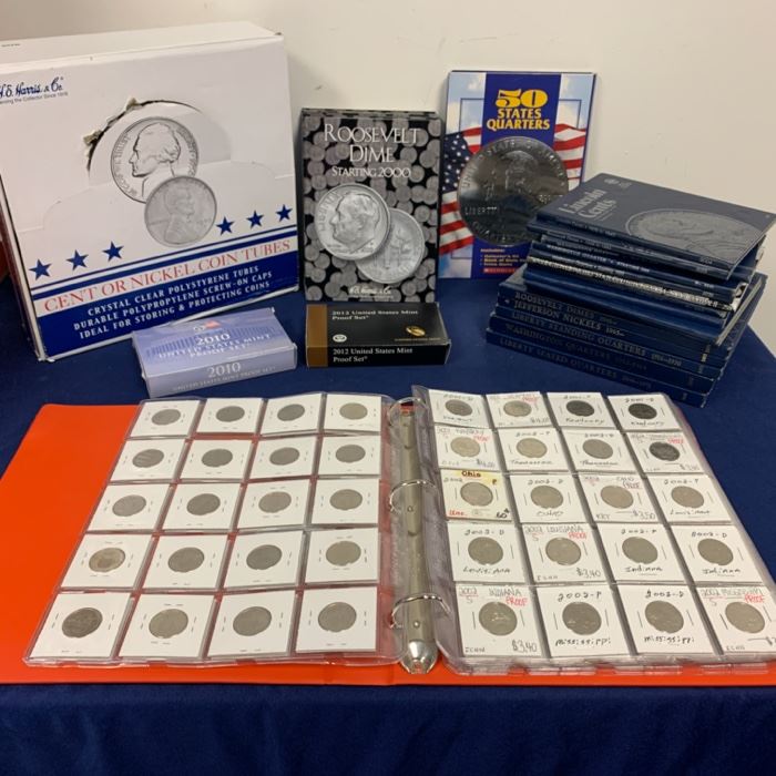 We have a large collection of mostly American collector coins, coin collector supplies, paper money, sterling flatware set, sterling serving pieces and thousands of collectible stamps. ONE DAY ONLY! Saturday June 13th 10am - 4pm 2700 Holloway Rd suite 106 Louisville, KY 40299 sample of coin types Indian head, wheat pennies, Lg pennies one full bank bag of un sorted wheat pennies Approx 80 US Mint Proof sets Nickels and buffalo nickels dimes pre and post 64 Quarters pre and post 64 Lg collection of unc 50 state quarters some silver halves and silver dollars Silver 1 Oz bullion coins...