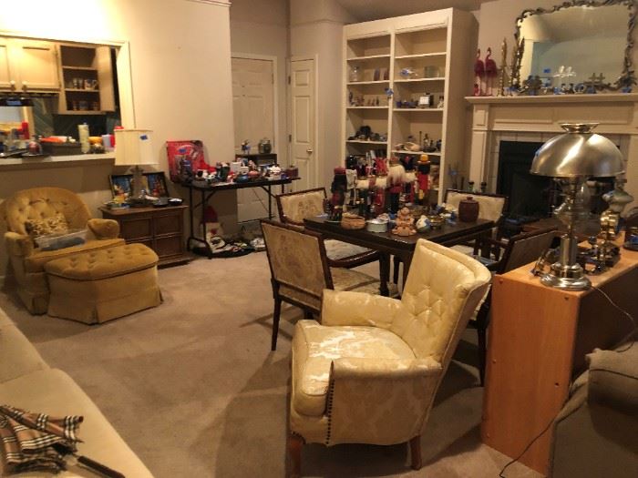Entire house needs to be emptied. Items include American of Martinsville vintage table with leaves and dresser, 1965 Thomasville bedroom set (includes king headboard, dresser and 2 end tables), Herschede Sheffield model 230 grandfather clock, antique solid walnut dresser with mirror, vintage card table and chairs, queen size canopy bed, matching twin beds, vintage king headboard, Lane cedar chest, vintage Samsonite card table and folding chairs, couch, vintage chairs, modular chairs/couch, large rolling training tables (84x42), dining table with two leaves and table pads, dining room chairs, vintage kitchen table with cane back chairs, two china hutches, small appliances, lamps,...