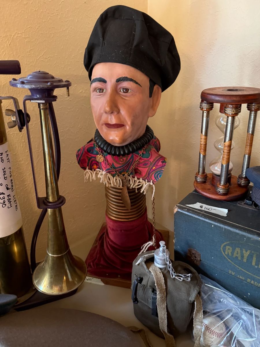 * Vintage Theatre Spotlight * Antique washer wringer * Black Americana Pictures and Advertising * Antique crank singer sewing machine Lotus design * Telegraph Key * Baby Daisy Vacuum *Cast Iron Tobacco G * MCM Swung Vase * Ethan Allen Country French Secretary, Sofa table, China Cabinet and end tables * Vintage Future telling bust (think Zoltar from the movie Big) * Raytheon case w/tubes * Thousands upon thousands of prints ranging from Louisiana Yam labels, botanical, anatomical, advertising, Victorian and everything in between. * Vintage Postcards *MCM Pole lamp *MCM pair of red Eagle lamps