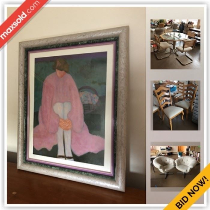 Framingham Downsizing Online Auction - Elizabeth Circle WILL SELL by Friday May 03, 2019 7:15 PM This online auction features ART: "White Stockings" signed lithograph by Barbara Woods, Black and white photo prints by artist Rachel A. Zare, Limited edition prints, Heddy Kun original oil painting and poster, Japanese prints and more! FURNITURE: Bedroom - Headboard with storage and matching side cabinets; solid maple dresser; MCM - Four drawer side table, dining room table, floor lamp; 41" glass and wood table with 4 cane back, chrome cushioned chairs; outdoor metal patio pieces and more! Yamaha piano. ELECTRONICS: Stereo components; NIB...