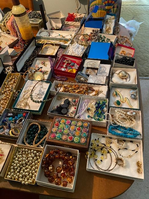 milk glass collection , hummels, small furniture , large collection of costume jewelry kitchen set and so much more clothing including vintage