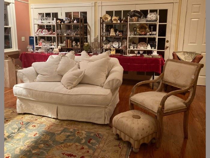 Furnishings and accessories from a very fine home in North Falmouth. Featuring traditional styles, high end decoratives, collectibles for everyone and an overall welcoming ambiance!!! Please join us as we are so pleased to offer: French Louis XVI style salon settee and multiple armchairs, J.M. Paquet pair of extra deep sofas with ivory matelasse slipcovers, Duncan Phyfe style dining set, ox-yoke front china cabinet and sideboard, traditional corner china cabinet; pair recamier armchairs and ottomans, contemporary wrought metal etagere; Diminutive Queen Anne style secretary and game table, Harden queen 4 pc. beroom suite with 4-poster bed, Harden blanket chest and...