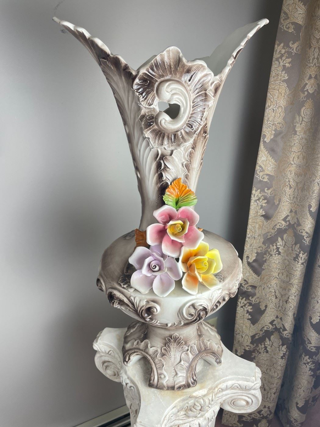 A little bit of everything here! Gorgeous Alcobaca large pottery pieces, beautiful Murano glass pieces, two dining room sets, an industrial sewing machine, Fine bedroom set furniture, copper mold collection. Costume Jewelry, fine china, a few designer purses. Waterford crystal, other fine crystal, MCM furniture stereo console piece. Marwal chalkware statue, tools, art, fine china pieces. Some Evening wear and clothing. Linens, shoes, Tupperware, Corelle, fine chine by Haviland.