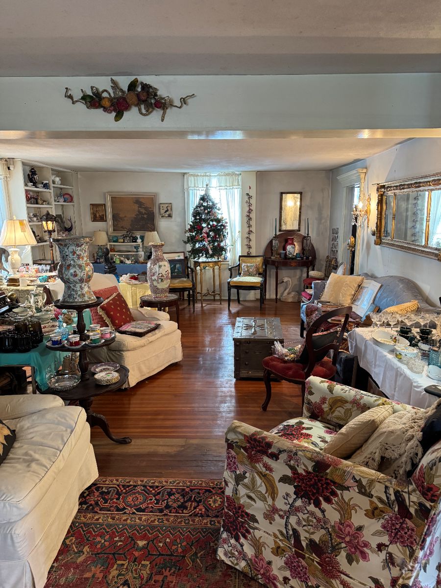 Estate sale: 7 Main Street, Stockbridge Ma. Antique and Vintage sale January 3rd, 4th & 5th Friday 8 am - 4 pm, Saturday 9 am - 4 pm, Sunday 9 am - 4 pm Complete contents of Home: Antique slag glass floor lamp, Victorian cylinder secretary desk, set of 8 Hepplewhite white style dining chairs, mahogany console table, marble top coffee table, hand hammered chest, 1800’s gold gild mirror, antique game table, empire dressers, marble top stands, side chairs, many stands, Boris riedel art, Helen McAuslan water color, oil paintings, lithographs, engravings and prints, table lamps and mirrors, High boy...