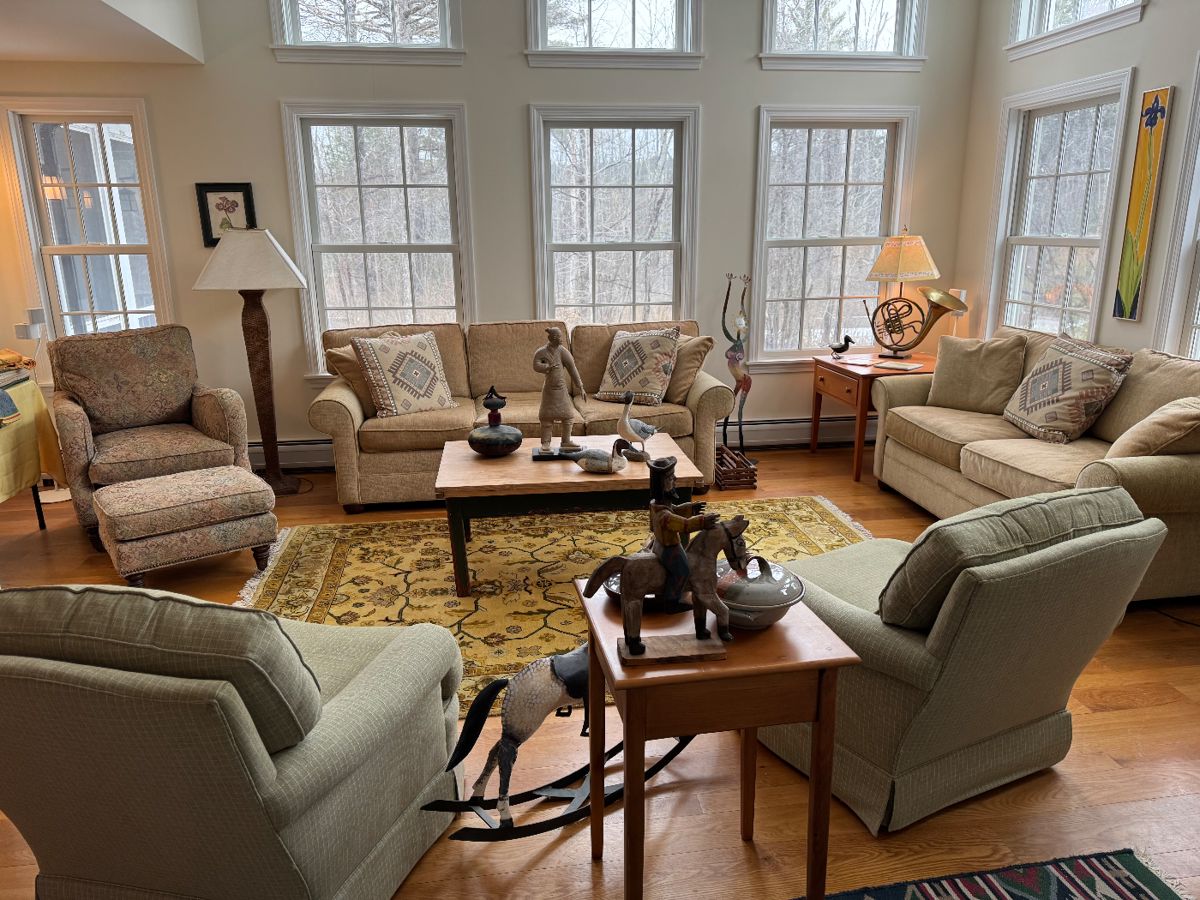 Estate sale Two day sale Contemporary and Vintage Sale: 8 Bean Hill Rd, Stockbridge, MA. January 24th and 25th Friday 9:00 am - 3:00 pm and Saturday 9:00 am - 3:00 pm Several pieces of Hunt country furniture - consisting of pair cherry night stands, settee, bookcases and bench. Pair of antique Adirondack twig rockers, nickels and stone mission rocker, Vanguard furniture - sofa and love seat, club chairs and ottoman, pair of Jessica Charles club chairs, queen bed, vintage French horn, table lamp, Chinese warrior soldier statue, Dave fox pottery vase, mcm lee Reynolds’s painting, Elaine Rainney painting, Japanese...