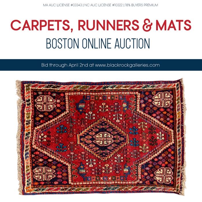 CARPETS, RUNNERS & MATS (BOSTON ONLINE AUCTION) SALE BEGINS TO CLOSE FRIDAY, APRIL 2 AT 8:35 PM EST LOCATION: BRG-BOSTON (WALTHAM) 26 ITEMS VIEW ALL ITEMS & BID ONLINE AT WWW.BLACKROCKGALLERIES.COM It's carpet time! Black Rock Galleries is pleased to present this collection of lovely hand knotted wool carpets including area rugs, mats, and runners. All lots are eligible for transports to any of the BRG warehouse locations for convenient pick-up. Happy bidding! VIEW ALL ITEMS & BID ONLINE AT WWW.BLACKROCKGALLERIES.COM *The items in this auction are available for BRG warehouse-to-warehouse transports for easy local pick-up at any BRG location:...