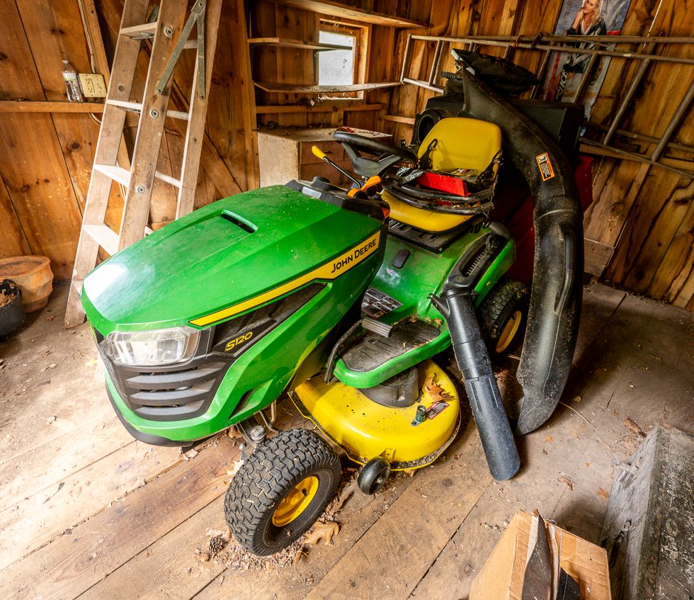 Partial contents Beautiful house in the woods. John Deere 42” ride on mower with trailer, 1 year old rarely used Savannah Banjo 5 string case and strap Pristine never used. Porch full of beautiful wicker furniture including 3 rockers, 2 love settees, small table, 2 painted tables, 2 painted tables, pair blue glass lamps, small cabinet, scatter rugs, turquoise hexagonal rug, large brass lamp, fireplace tools, small wood Japanese figures, assorted small crèches figures, air fryer, Christmas plates, framed clown picture, camel back love seat, framed prints, photos, 84 piece set Sango china, 31 piece crystal luncheon set, 11’x8’’x2 Khouri...