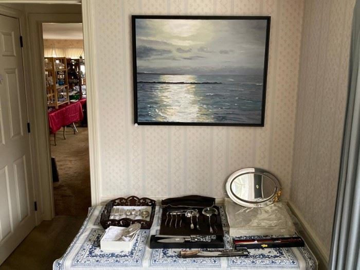 Small house, plenty of treasures and an opportunity to acquire paintings by a well known local artist. This sale features approximately 75 oil paintings on canvas and board by Cape Cod artist Kenneth Evans. His seascapes, marine subjects and landscapes are all represented and priced well below gallery levels. Many local views include Bass River, Sandy Neck, Hyannis Harbor and more as well as sailing vessels large and small. A preview of his work can be seen at https://kennethevansart.com/home Also included is a wide variety of fine crystal stemware and serve ware, Wedgwood 'Balmoral' and other china, impressive Old Paris...