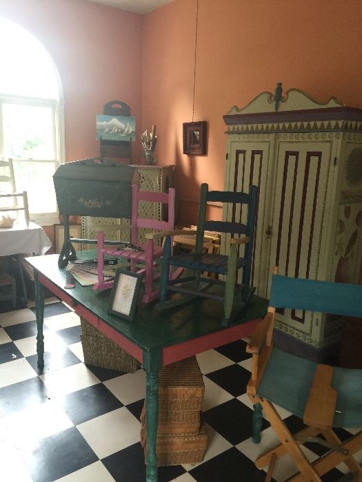 Large Antique Cupboard, Chest of Drawers, Hooser Cabinet, Game Table, Advertising Tins and Wooden Boxes, Handpainted Furniture, Oil Cloth and Karastan Oriental Rug, Bamboo Furniture, Sterling Flatware, Beds, Upholstered Chairs, Dining Room Table , Childrens Furniture, Wicker Rockers, Assorted Art Supplies, Frames, Mats, Paint, Canvas, Clothing, Cut Glassware, Quilts, Household, Garage, Jewelry, Xmas and more....
