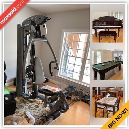WHAT IS IN THIS AUCTION? This online auction features a Hobart M. Cable Baby Grand piano. A Schoenbeck crystal chandelier. Furniture: Carved teak set - sofa, three chairs, coffee and 3 side tables, corner cabinets; Dining room suite, plus several more table and chairs sets; office furnishings; many patio table, chairs, loveseat, armchairs and ottomans; Bedroom suites: Four poster and canopy beds with nightstands, chest of drawers. Exercise Equipment: Hoist Gym and a NIB Gazelle Fitness Trainer, Nordic Track AudioRider Bike, 2 Ab Machines and more! Appliances: GE and Hotpoint fridges, Acme mini fridge. Two sets washers and dryers. Yard...