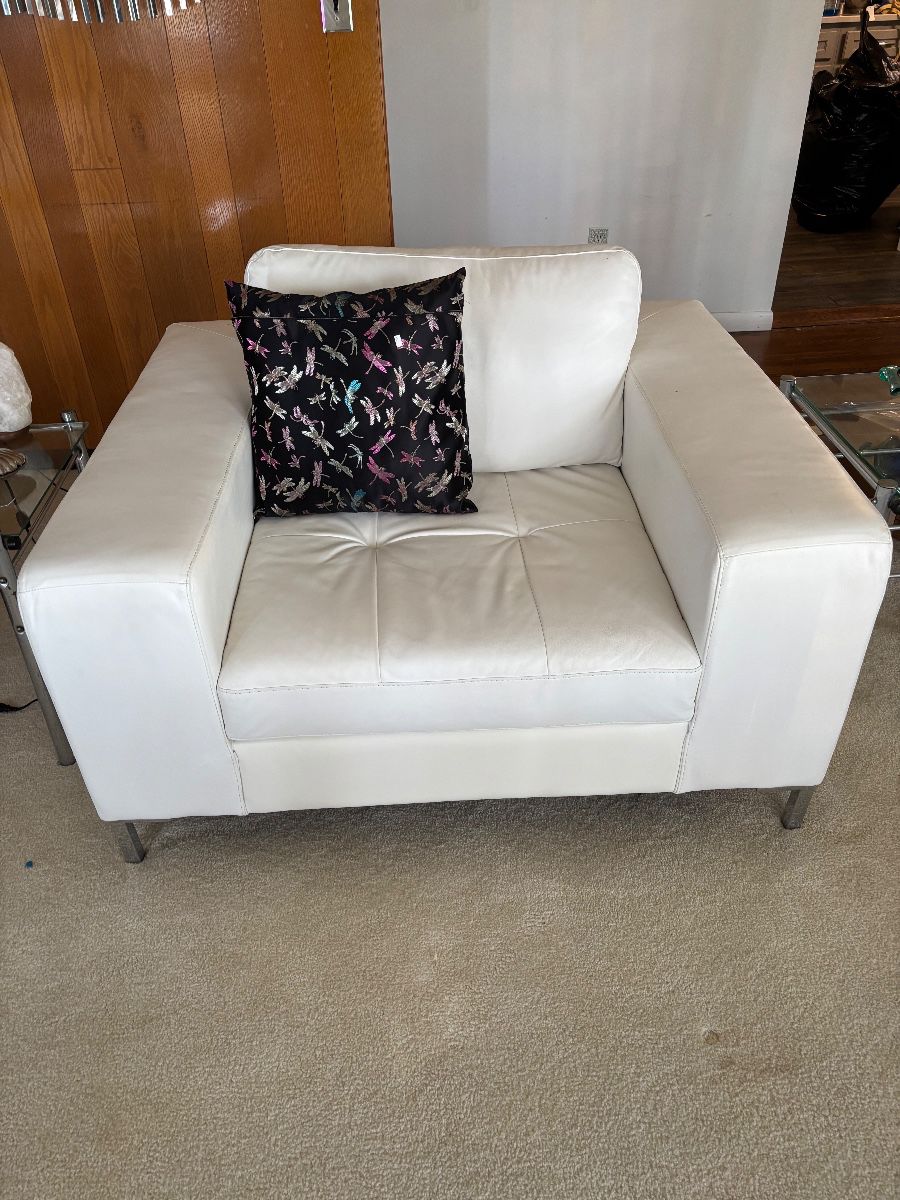 FURNITURE & DECOR- White Leather sectional w/matching chair 2 Upholstered sofas & Love seat reclining chair glass coffee & end tables Vintage square coffee table Dining rm set w/burnt orange leather/wood chairs Large glass top table & 4 matching chairs Large size blonde Queen size bedroom set 2 twin beds w/Simmons mattress Day bed w/Sealy mattress Wicker/Rattan couch & love seat Wicker rocking chairs (Vintage) metal patio set metal rocker & foot stool Wood desk’s & computer desk filing cabinets Modern and Shabby chic lamps, art work & small cabinet Curio cabinet book shelves Murano art glass collection and Beach...