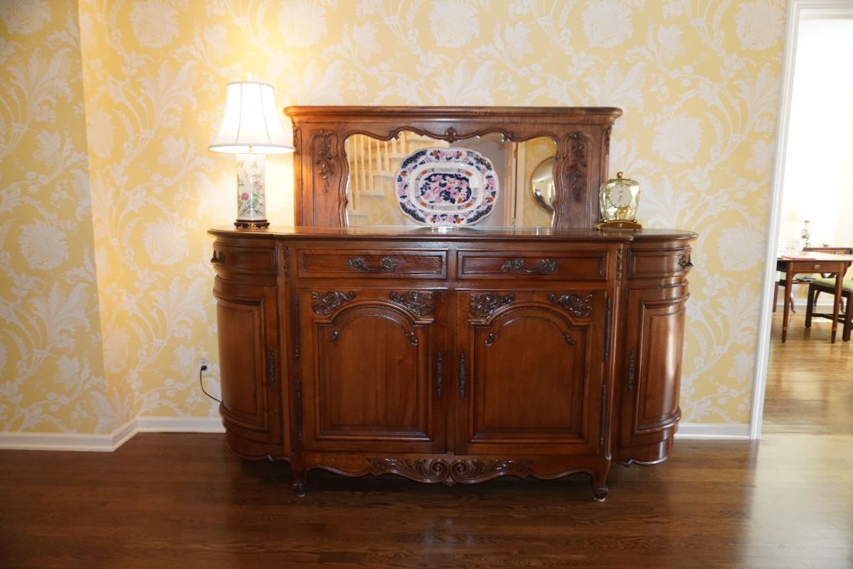 Fabulous Mario-Buatta-style colorful floral interior design throughout with antiques, fine furnishings, art including antique paintings, rugs, lamps, decorative accessories, decorative pillows, vintage and antique decorative porcelain & china, transferware, plus crystal, silver, linens & bedding, books, jewelry, and more! THE CONTENTS INCLUDE: FURNITURE Custom down filled chintz floral sofa, 90”, Antique oak Queen Anne style low boy, George III style flame mahogany low boy, Custom 78” green striped damask sofa & matching tufted ottoman, Large antique heavily carved oak cabinet with glass doors and silk lined interior, Vintage down filled wing back chair with mahogany legs, Antique drop-leaf gate leg...
