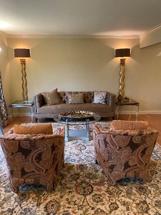 Bloomfield Hills estate sale Paul, decorator, selected, furnishings include B&B Italia, baker furniture, and Henredon grest accessories throughout Artwork and more…. custom square glass, top dining table with Mcquire bamboo base Set of 6 English ebonized, custom upholstered, dining chairs Set a 4 custom upholstered blue dining chairs Antino, Citterio for B&B Italia counter stool Custom curio cabinet by Carasole French tufted, leather stool Round deco mirrored table Swivel chair Bamboo table with leather top Custom, upholstered, Baker sofa Pair of Mid Century and tables with Lucite legs Pair of tall custom, gilded wall lamps with shades Custom coffee table...