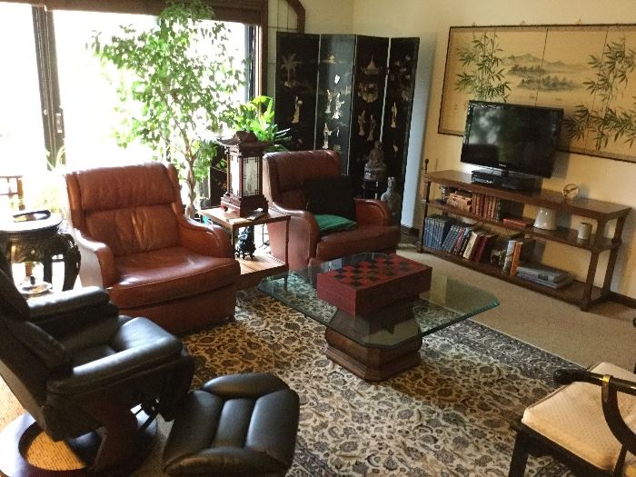 A sale with an array of tastes. Many Oriental furniture pieces, a bit of Mid Century, Vintage and Antique, Supplies for Acrylic Painters. Art, French, Law Hardcover Books Tommy Bahama Look Glass Top Dining Table w/6 Chairs Chinoiserie Oriental China Cabinet Oriental Style Buffet Surya “Adana” Area Rug 5.6 x 8.6 Exotic Oriental Character Chess Set in Box Asian Screen 4 Hinged Panels (2 available) Pair of Asian Horseshoe Chairs Black Lacquer Thonet Bentwood Rocker Live 6' Ficus Tree King Size Pewter Metal Headboard, Nightstands & Bench Men's Fine Clothing L/XL Patagonia, Calvin Klein, Guess, Ralph Lauren, Christoper Banks Beautiful...