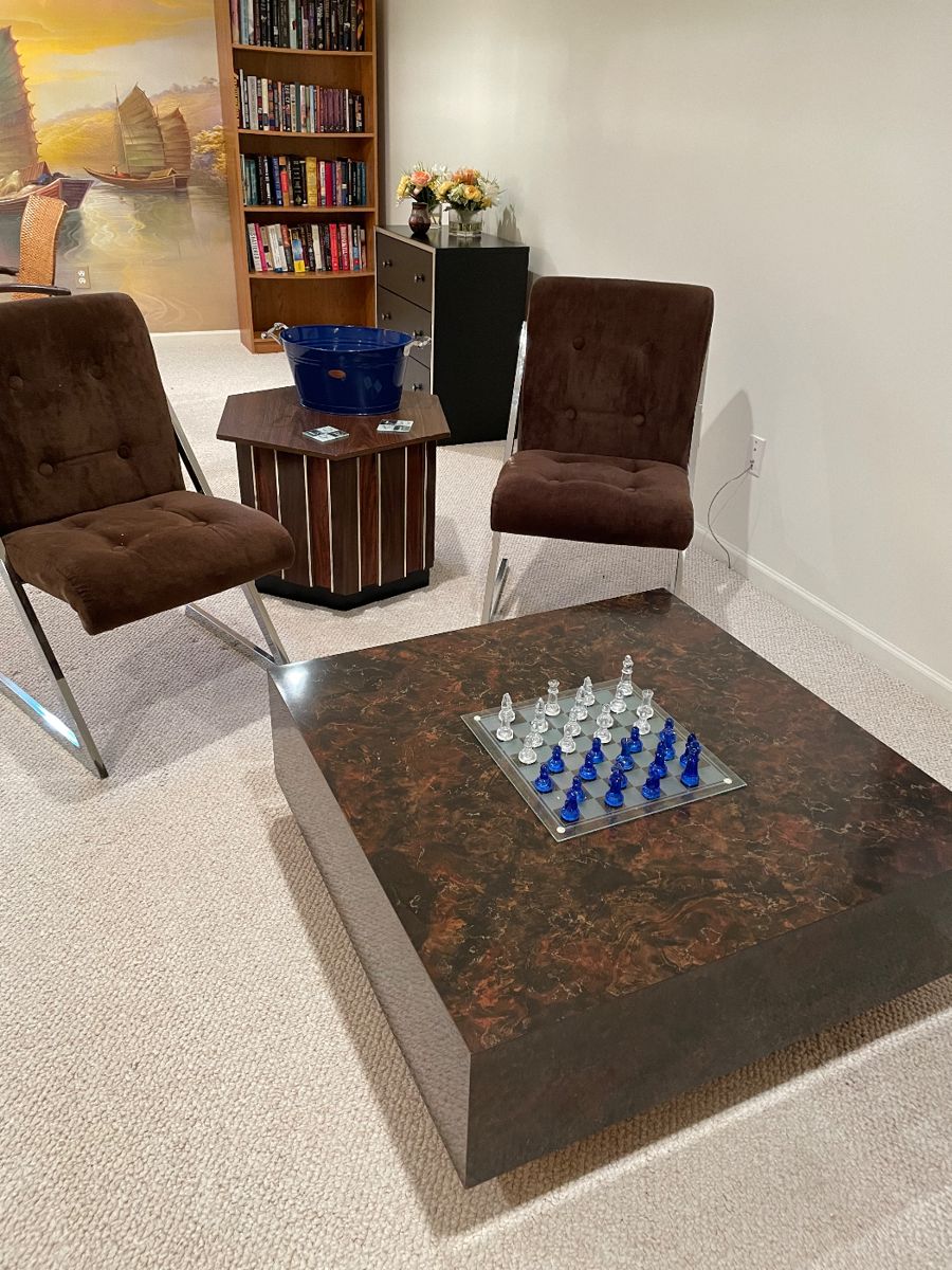 This house is very clean and has great furniture: transitional and MCM pieces. Large selection of Men's Clothing - many New with tags (size M - L), and women's (size S - M). Housewares, Books and more! Very clean and well curated selections for your shopping pleasure: Furniture: Patio: Loveseat, 2 armchairs, 2 ottomans, 2 side tables, Round Patio Table with 4 chairs, Ivory Couches - 2, Ivory Love seat, MCM - Brown Velvet and Chrome side lounge chairs, MCM square laminate cocktail table, Leather Couch - ivory, Console tables, Bar stools - 2, Dining Table with leaves, table pads...
