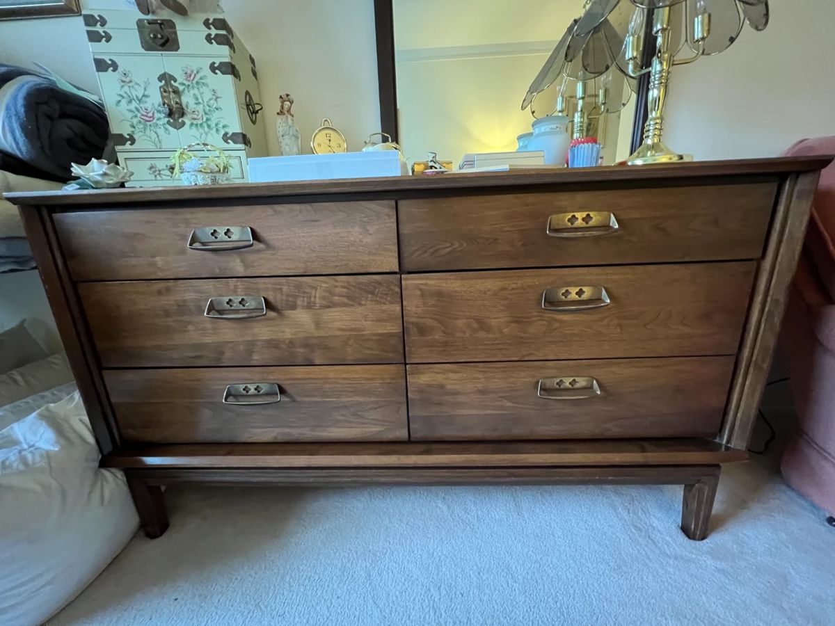 Furniture : MCM full-size 5-piece bedroom set, couch, loveseat, dry bar, La-Z-Boy rocker recliners, rocking chairs, TV stands, small curio cabinet, wood dining table with six chairs, lamps, wall clocks, etc. Jewelry : costume, watches, rosaries, pins, broaches, etc. Lladro figurine, and Royal Dalton. Housewares : crystal vases, glasses, bowls, china set, pots, pans, teacups, vintage servingware, etc. Linens : full-size sheet sets and comforters, towels, placemats, etc. Garage items : hand tools, outdoor patio chairs, toolboxes, coolers, six large indoor chandeliers. Clothing : Women's sizes M-1x, men's sizes XL-2x, evening gowns, coats and jackets. Women's shoes 8M. Misc .:...