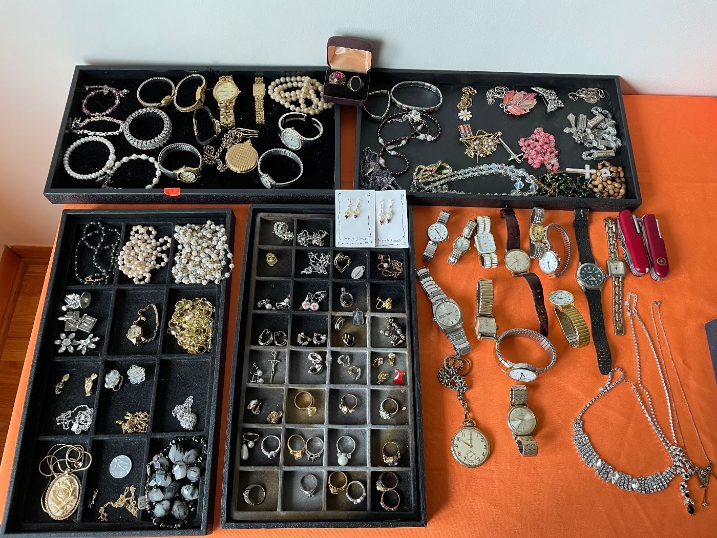 Vintage kitchenwares, Christmas decorations, jewelry, mid century furniture, and more! Super Nintendo console and games, jewelry, seiko watches, pocket watches,purses, Vera Bradley, vintage magnavox record console, Capodimonte vase, crystal, vintage pyrex, pink pyrex, moss rose china set, cutco knives, Starbucks mug, daewoo microwave, vintage ceramic Christmas tree, copper cookware, mid century bedroom set, full beds, Philips TV, LG TV, clothing, linens, steamer trunks, vintage happy Santa Japanese tin toy, vintage merry mushroom cookware, home decor, golf clubs, taylormade, artwork
