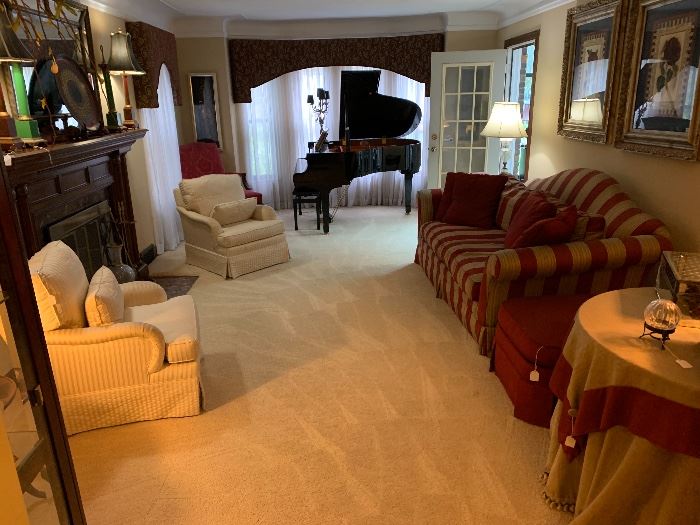 Another Bernard Davis Estate Sale Another spectacular estate sale in North Rosedale Park, Detroit Round table with custom-made tablecloth, Lamps, Decorative mirrored box and wood box, Decorative accessories, Mahogany accessory table, Pair of Sherrill Upholstered Club Chairs with swivel base, LT Design Upholstered sofa with matching ottoman, Art, Chippendale-style armchair, Pair of upholstered club chairs with matching ottoman, Vizio 24” flat-screen TV, Wood entertainment cabinet, Wood Filing cabinet, Black painted writing desk with chair, Black cane back settee, Pair of black painted chairs with round table, Mahogany bow front cabinet, Glassware, China, Glass serving trays, Mahogany buffet cabinet, Mahogany China...