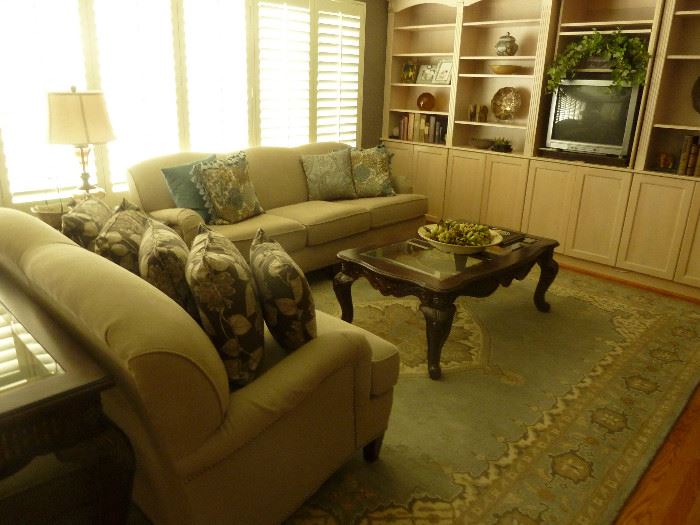 This is just a beautiful sale! We have an ivory Baker sofa, everything is in perfect condition, neutral sofa and loveseat, wing chair and ottoman, pair plaid upholstered armless chairs, TV stand with built in fireplace, mirrored console, white wooden queen bed and dresser, queen upholstered bed with black dresser and nightstand, carpet, lamps, 55” Sharp TV, better jewelry including David Yurman, Tiffany bracelet and Silpada, girls, boys and women’s clothing including plus size designer clothing such as Carolina Herrera, B. May purses, large selection of equestrian items, clothing, horse blankets and products, this is a great sale! Don’t miss...