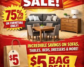 75% off furniture. $5 bag.