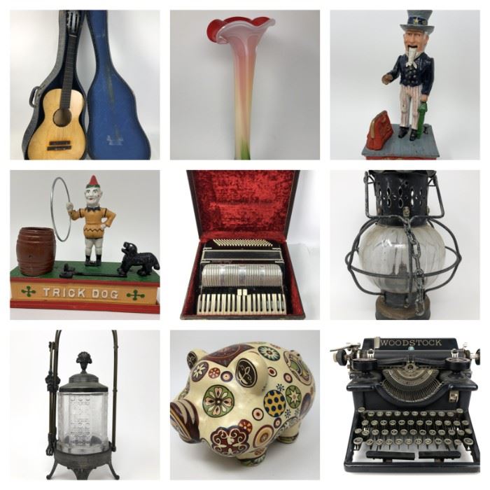 Multi-estate online auction filled with vintage treasures of all sorts. Collectibles, furniture, tools & more! All lots start at $1 with no reserve and pick-up will be at our warehouse in Holly, MI the Thursday-Saturday following auction end on Tuesday night. See below for a list of included lots: LOT LIST: Antique Hand painted Milk Glass Lamp Shade Vintage solid wood & vinyl barrel chairs on wheels Vintage Handmade Quilt and Pillow VTG Crown Crafts Virgin Acrylic Childs Blanket Vintage Cast Iron Bank "Trick Dog" Vintage Uncle Sam Cast Iron Bank Vintage 1907 Cast Iron McCallister Delivery Truck Vintage Stars...