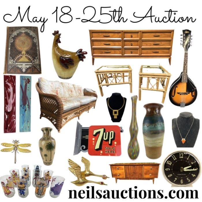 Neils Online Auctions 418 Hadley St. Holly, MI 48442 Date(s) 5/18/2021 - 5/25/2021 Tuesday, May 18th: Open for bidding. Tuesday, May 25th: Lots begin to close. Neil's Online Auctions Multi-Estate Sale Auction! Lots of great MCM Decor, vintage finds, household goods, antiques, books & more! -All lots start at $1 with no reserves. - Bid Tuesday thru Tuesday. Lots start closing at 7:30PM at a rate of 5 per minute. -Worldwide shipping available LOT LIST Ernest "Chicken Man" Lee Original Folk Art 0 Art Nouveau Ad Prints on Glass Window 0 Susan Bailey Limited Ed Serigraph "What A Sight 0...