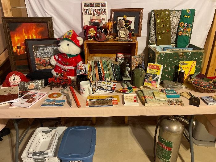 This exceptional home has a bit of everything from a garage FULL of tools along with trains, toys, firefighting and scouting collectibles. Several firefighting brass hose nozzles, extinguishers, air raid hand crank siren, LaFrance firetruck search light, a vintage call box, magazines & books. There is a large amount of Franciscan Apple pattern dishes, general kitchenware, Lenox Chinastone Poppies on Blue, Martha Stewart dinnerware, Corelle dinnerware, Noritake “Blythe”, Nikki “Blossom Time”, Spode Emma’s Garden”, Nikki Country Side patterns, Wedgwood Nantucket dishes, pink depression, crystal and china items, bell collection, Longaberger baskets, large amount Christmas including Jim Shore and Lenox. There...