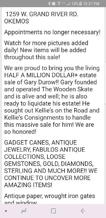 This sale is going on now! 9-6pm 11/29 & 11/30. 12/1 thru 12/3 9am - 3pm 12/6 & 12/7 10am - 6pm 12/8 thru 12/10 9am - 3pm This sale will be running until December 29th! Stay turned for days and times. Follow Kellie's Consignments FACEBOOK page or www.kelliesconsignments.com for week to week schedule. Updated pictures added often. Gadget canes, wrought iron gates, diamonds, gold, gemstones of all kinds, pearls, antiques from the 1700's & 1800's, architectural artifacts, pocket watches, vintage hats, swagger sticks, pocket watch holders, China, lots of opera goggles and much more!