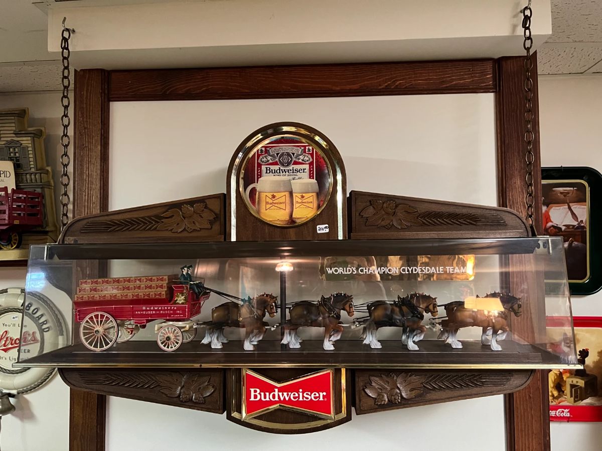 Variety of vintage beer signs, mirrors, beer steins, etc., vintage roll-down map of Metro Detroit area, vintage-style men's bicycle, vintage books, and vintage drill press. Housewares: kitchenware, china, glassware, large selection Candlewick pieces, and large set of Mikasa stoneware dishes. Furniture: vintage dining set with buffet and china cabinet, beige suede loveseat, solid wood hall tree, vintage washstand/dresser, two large steam trunks, vintage children's desk, and vintage baby buggy. Portable electric fireplace, RCA stereo and speakers, vintage Spartan in-cabinet radio, Hoover vacuum, slide projectors and screen. Clothes: men's suits, women's full-length mink coat, wedding gown, and prom dress. Linens: full/queen...